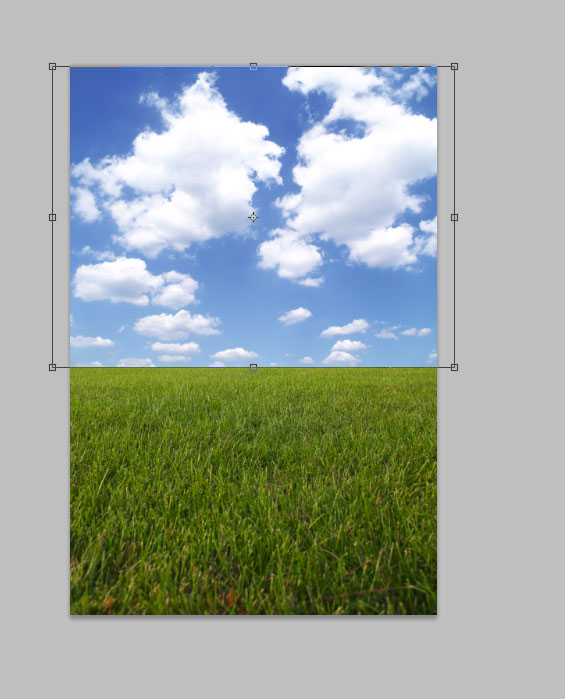 Open file “Sky” and press Ctrl + A to select all then Ctrl + C to copy. Paste into our document (Ctrl + V) and Free Transform (Ctrl + T) like shown below. Place this layer behind the ground layer. The horizon line looks very unrealistic because it is so well defined. We will have to blur it a little to make more genuine. To do this first add a layer mask to the “Ground” layer (Layer > Layer Mask > Hide All).