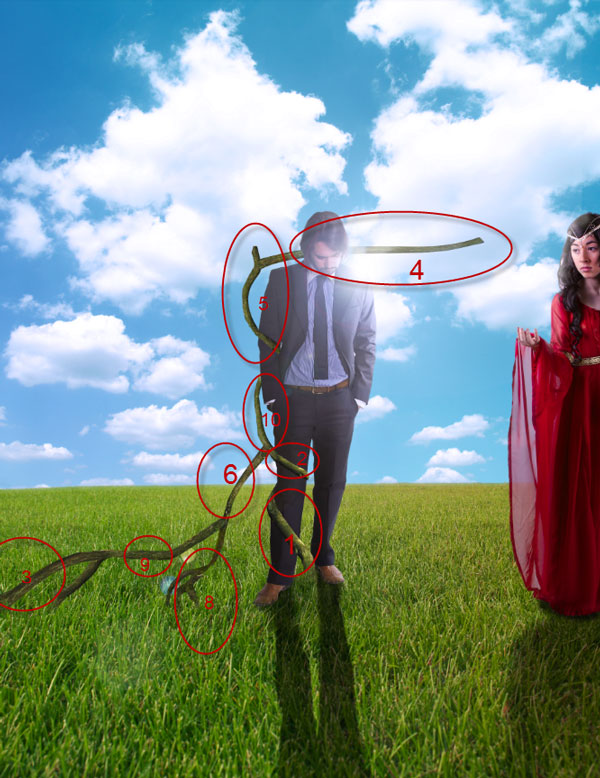 I will not show you how to place each branch (there are 14 or so) but instead I will show you the numbered selections in the branch file and the same selections in our scene. It is up to you to Free Transform and if necessary to add an Adjustment Layer. But you should always add a layer mask to make the transition between branches smoother. I used the Pen Tool to make selections of branches and when I finished drawing my path I pressed Ctrl + Enter to transform path into selection. After that you now the workflow (Ctrl + C to to copy an Ctrl + V to paste it into our scene).