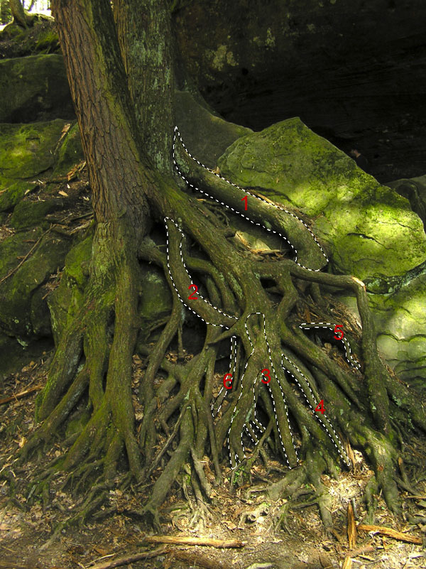 Now for the tedious part. To build the tree we will make selections of roots and place them into our document. If necessary apply a Free Transform and Warp to tweak the form and size. Some roots will be lighter so we will have to add clipped adjustment layers. Also, each root (or branch how I named my layers) will have a layer mask in which you should paint with a round soft black brush at 40-50% opacity in the places where the branches join each other to make the transition smoother.