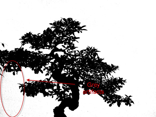 To do that we will use a Curves Adjustment (Image > Adjustments > Curves). First drag the left slider towards the middle until the bonsai it is as black as possible while the background remains as unchanged as possible. Next drag the right slider towards the middle until the background it is as white as possible and the bonsai remains as unchanged as possible. Below it is the Curve Adjustment I used to achieve my effect.
