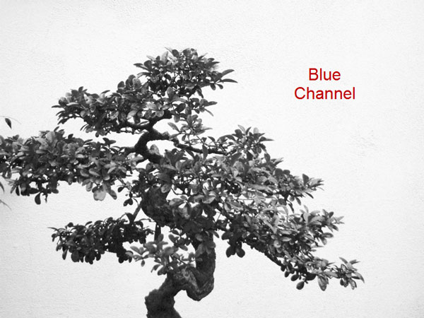 Now let’s add some branches with leaves on them. For this I use three different “Bonsai” images. Open image “Bonsai 1”. This one is pretty easy to select but still tedious with the usual selection tools (Quick Selection or Magic Wand). You could give it a shot or you can try the channels way – the good way. First let’s take a look at each channel and see which offers the greatest contrast between the subject (the bonsai in our case) and the background. I decided that the blue channel is my shot. The only trouble with this channel is that it needs more contrast because in a channel white is selected, black is deselected and gray it’s partially selected. Our channel it is mostly gray. So what we have to do it is to make our subject completely white and the background completely black (or inverse and after we’re done we will simply invert the selection by pressing Ctrl + I). First make a copy of the blue channel (by right-clicking and choosing Duplicate Channel). Next you should do:
