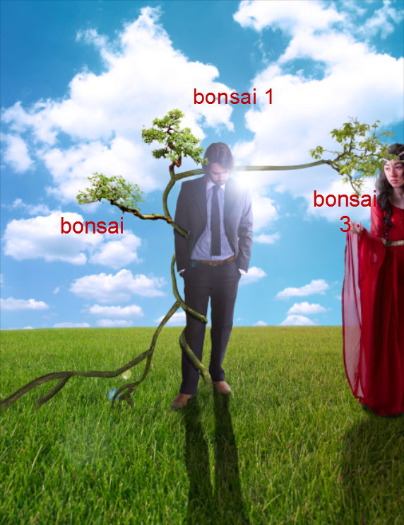 Place the bonsai trees as shown below. If necessary Free Transform and Warp. In the next steps we will adjust the saturation and the color of the bonsai trees to make them as similar to the branches as possible.