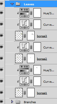 Apply a Curves Adjustment layer and a Hue/Saturation Adjustment layer to the third bonsai. I grouped all the bonsai related layers into a group called “Leaves”.