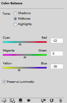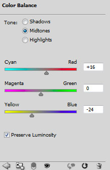 Add a Color Balance adjustment layer (Layer > New Adjustment Layer > Color Balance) and use the following settings. This will unify the colors of the sky and ground and will increase the saturation thus making the colors more vibrant.