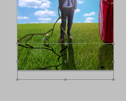Fill the selection with black and change the visibility of all the other layers on so you can see were you’re putting your shadow. After you’ve turned one the visibility of all other layers on select the “Shadow Branches” layer and press Ctrl + T to free transform. Drag from the upward boundary towards bottom until you have flipped the layer upside down. You can also Warp the layer to finely tune it. Apply a 3-4px Gaussian blur and change the blend mode to Multiply with an opacity of 53%.