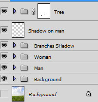 Time to add put the shadow from the branches on the ground. The fastest way to do this is to group all the branches related layers into one group and name this group tree. Then turn of the visibility of all other groups and layers but leave the “Tree” visibility turned on.