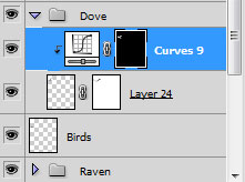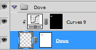 Add a clipped Curves Adjustment layer and drag the curve upwards to lighten. With a round soft white brush at 50% opacity paint the tail and the chest of the dove.
