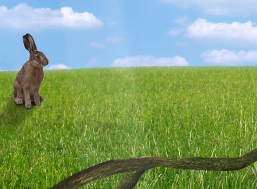 Open file “Rabbit” and make a selection of the rabbit. Copy and paste into our scene. Free Transform like shown below than paint some shadow on a layer beneath this layer. Change the shadow layer blend mode to Multiply.