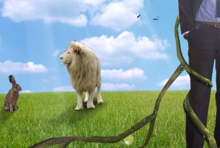 Open file “Lion” and make a selection of the lion. Copy and paste into our scene. Free Transform like shown below than paint some shadow on a layer beneath this layer. Change the shadow layer blendmode to Multiply.