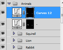 Select all the animals (lion, squirell and rabbit) and press Ctrl + G to make a group. Change the blend mode to Normal and at the top of the layers, inside the group add a Curves Adjustment layer.