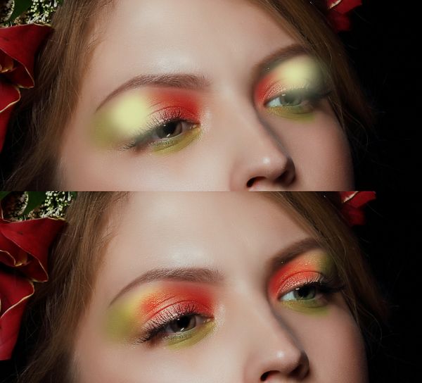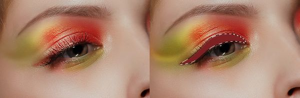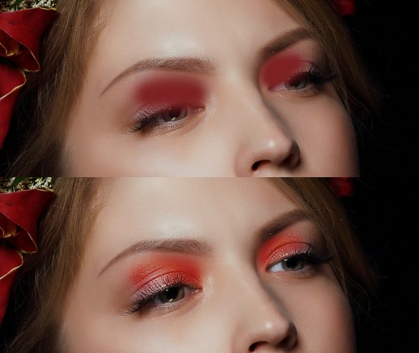 Create a new layer and use a soft brush with the color #7e2224 to paint on the inner edges of the eyes. Change this layer mode to Overlay 100%: