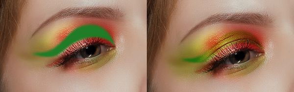 Use another color ( #597540) to paint on the outer edge of the left eye. Change this layer mode to Soft Light 100%.