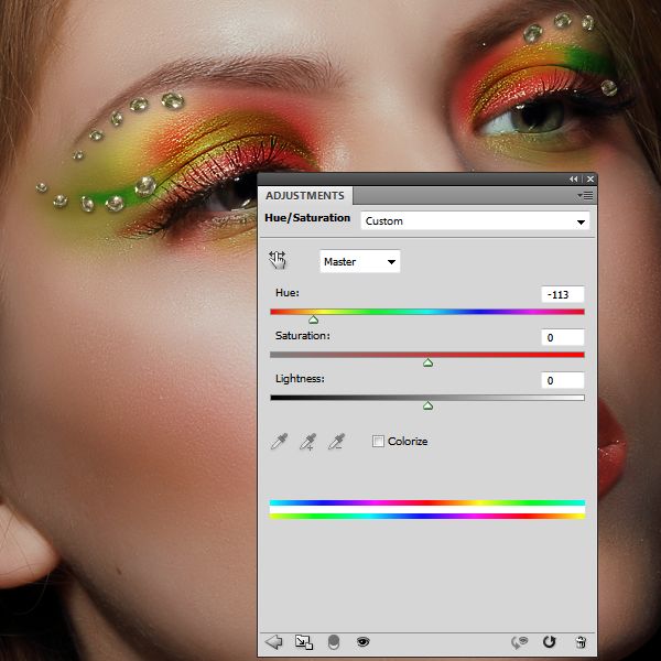 Select all the gem layers and press Ctrl+G to group them. Change this group’s mode to Normal 100%. Use a Hue/Saturation adjustment layer at the top of the group to match the gem color with the face:
