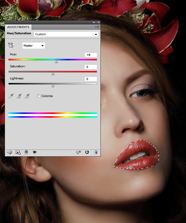 First we’ll fix the lip color to fit the colors of the cheeks and the flowers on her head. Use the Polygonal Lasso Tool (L) to select the lips only. Go to Layer > New Adjustment Layer > Hue/Saturation: