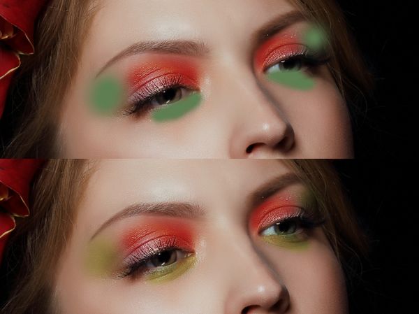 Make a new layer and use a soft brush with the color #5e8052 to paint on the lower and the outer edges of the eyes. Set the mode of this layer to Overlay 100%: