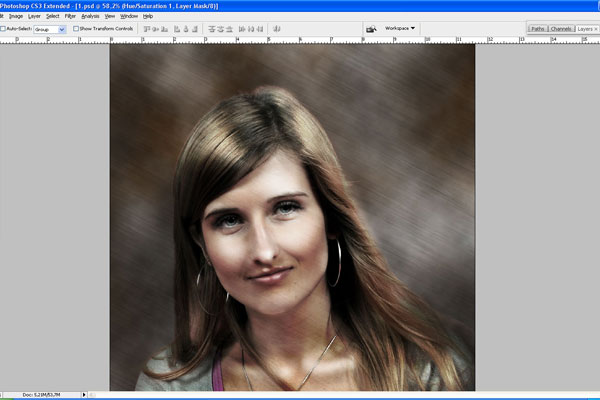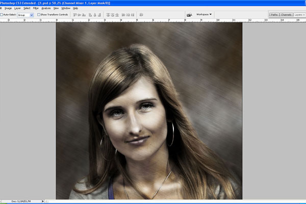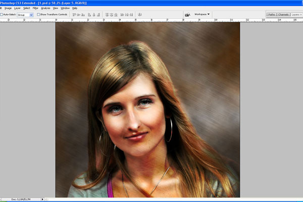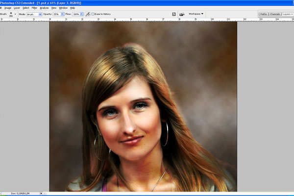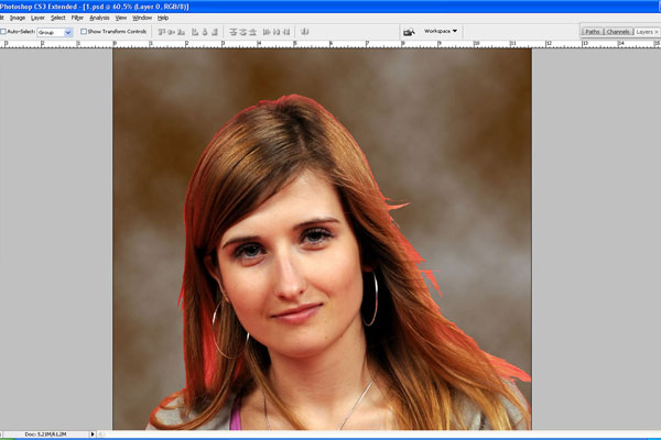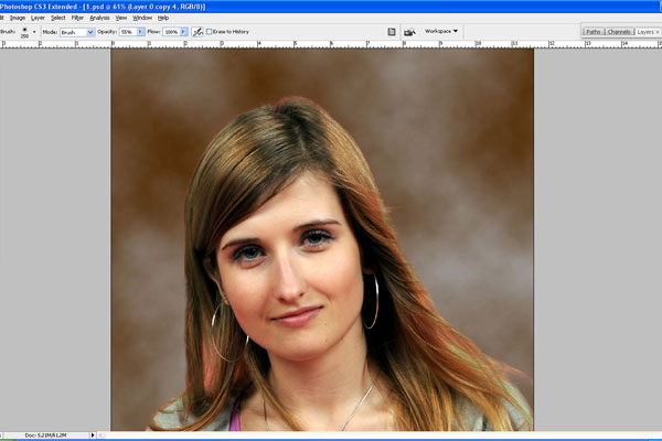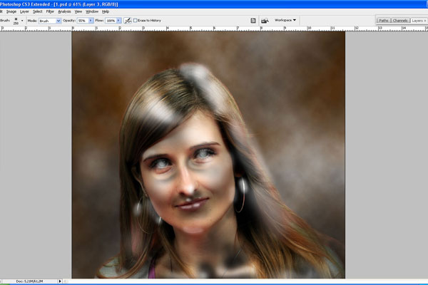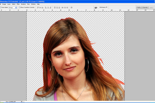 Then go back to the layer with the lady, use the Eraser Tool with a soft round brush of small diameter and make the border between her and the background softer by erasing some parts of the hair.