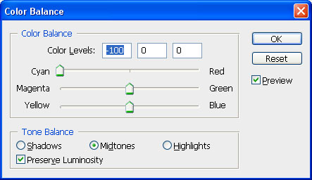 Now we have to reduce the red hue on the photo. Duplicate the current layer with Ctrl+J and use Image > Adjustments > Color Balance on the copied layer to edit the color balance.