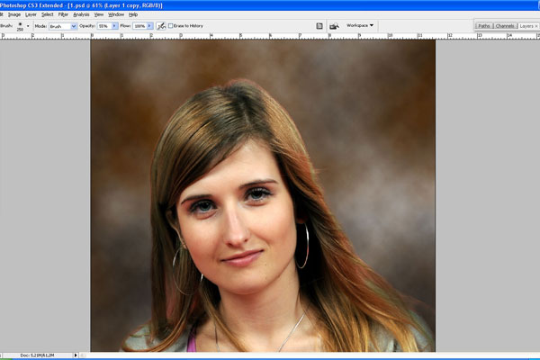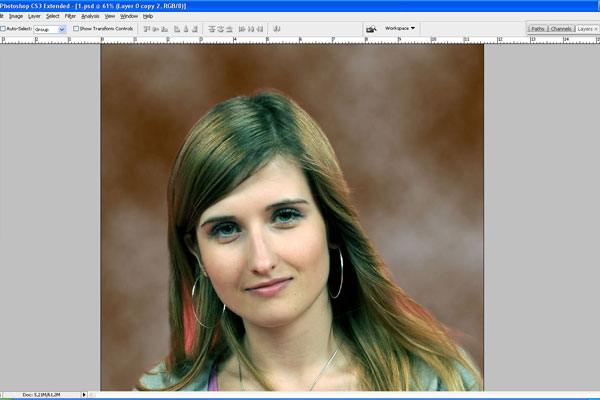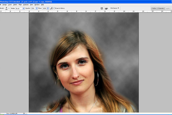 Then use the Eraser Tool and soft round brush to erase part of background as on my screenshot below.