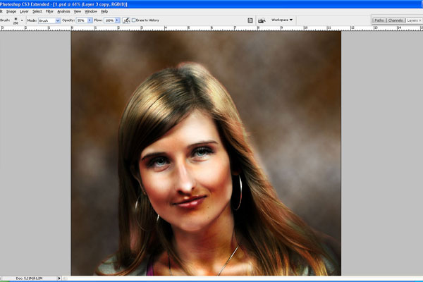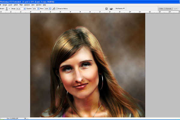 It clearly shows that in the shaded areas we used black color, and for the lighter areas used white, that have increased the glare and shadow. Again turn back to Overlay mode and make one more copy of this layer. Change the mode to Soft Light for the copied layer.