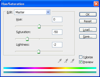 Create an adjustment layer with Layer > New Adjustment Layer > Hue/Saturation to reduce the strong contrast.