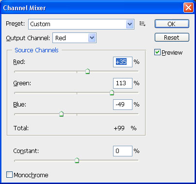 Create another adjustment layer with Layer > New Adjustment Layer > Channel Mixer to achieve the desired effect: