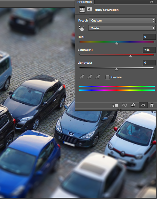 The tilt shift effect gives our photos the look of miniature models and in real life it is achieved with some special lenses. Let’s improve the effect by increasing the saturation of our photo ( we assume that the objects in the photo are miniatures and probably have intense colors). Create a Hue/Saturation Adjustment Layer and increase the Saturation slider to +36. This step will increase the saturation of our photo and create some nice rich blue colors overall.