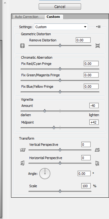 We could create this vignette by hand by simply painting with a soft brush but luckily there’s an easier way to do it with Photoshop. Go to Filter > Lens Correction and click on the Custom Tab. Change the Vignette Amount to -40 and the Vignette Midpoint to +42. Once you’re done doing these steps press Ok.