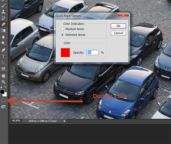 We will use the Quick Mask for our next step but first we must change some essential settings. Double click on the Quick Mask icon (placed just below the foreground/background change color icon). A window name “Quick Mask Options” will appear. Choose “Selected Areas” from the Color Indicates radio buttons and click ok.