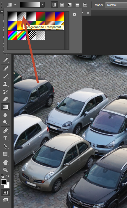 Now select the Gradient Tool from the toolbar on the left. Once you’ve done that click on the drop down arrow (in the tool’s option toolbar, just below the menu items) and select foreground to transparent. Now our gradient tool will make our gradients fade to transparency.