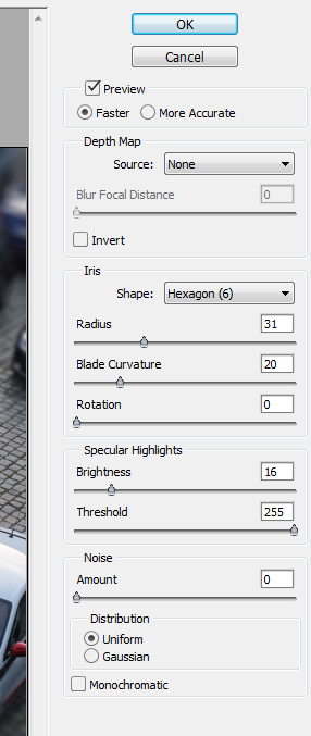 Now that we have the selection let’s apply some blur to it. Go to Filter > Blur > Lens Blur and use the settings shown below. Press Ok and you should be able to see or base Tilt Shift effect applied.