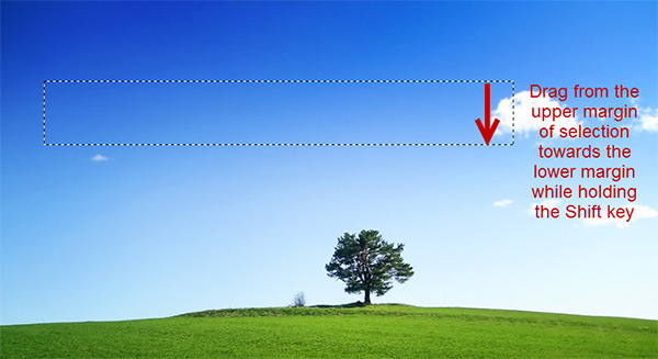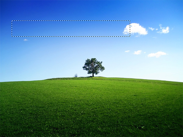 Open file “Sky”. This will be our base image on top of which we will create a realistic rainbow. First let’s create a new layer by pressing Ctrl + Shift + Alt + N. Now select the Rectangular Marquee Tool and create a selection as shown in the image below.