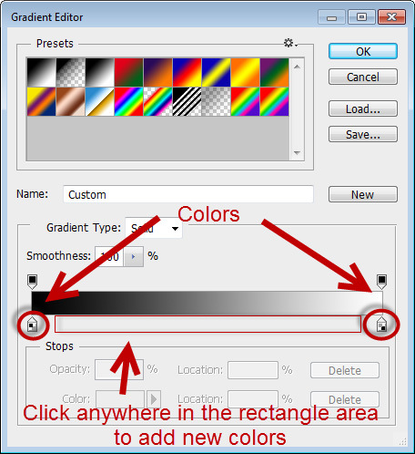 The following window (called the Gradient Editor) will appear. The little arrowhead icons underneath are the colors that form the gradient. Click just below the gradient representation to add new colors. You can also click on the colors and move them around after you have created them. Double click the arrowhead icons to change the color.