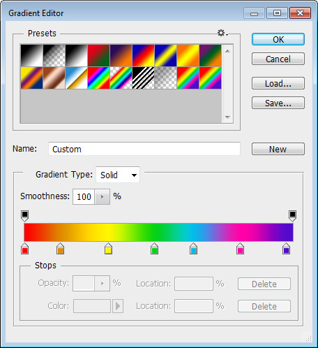 Add the colors shown below to your Gradient Editor window and click OK. They are in order: red, orange, yellow, green, blue, magenta, cyan.