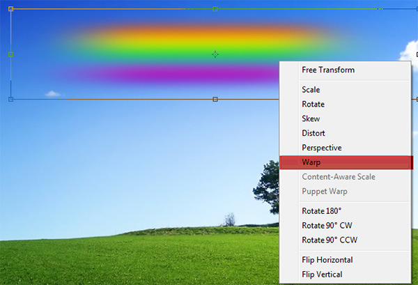 We are almost ready with our rainbow. Let’s add some curvature to our rainbow. While on the gradient layer press Ctrl + T to enter Free Transform. Right click on the gradient and from the drop down menu choose Warp.