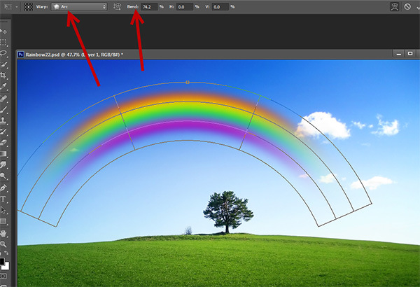 In order to bend it in a nice fashion choose from warp options (in the upper Options Bar) Arc and play a little with the Bend value until you obtain a nice curved rainbow. Press Enter after you’re done.