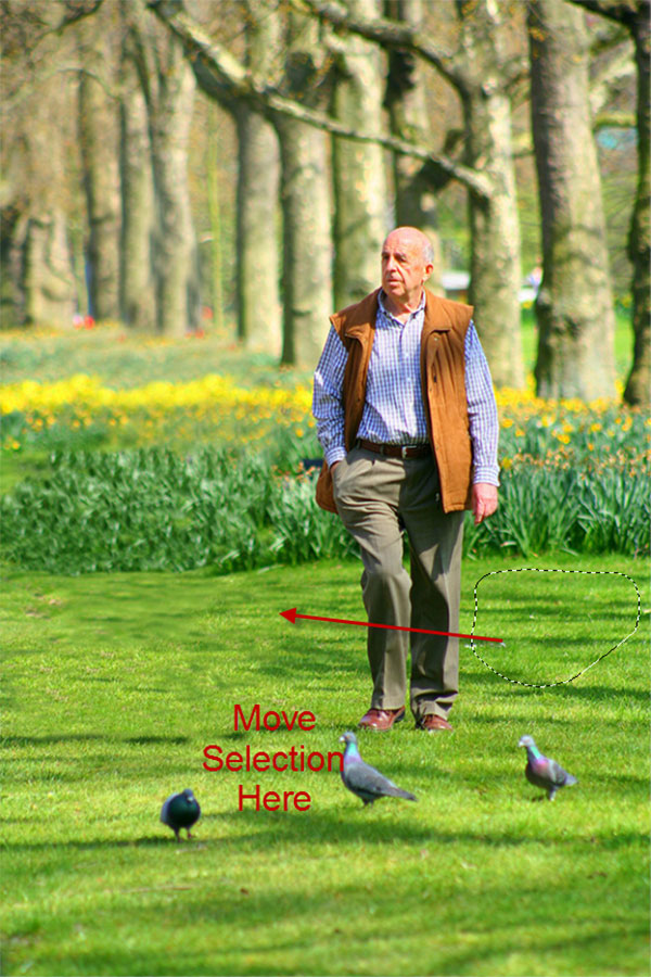 The result still looks a bit unnatural so let’s create a selection of good grass from the right side of the old man. Create a selection using you favorite selection tool, press Ctrl + Shift + C to copy merged, create a new layer (Ctrl + Shift + Alt + N) and paste merged (Ctlrl + Shift + Alt + V). Move the newly created layer to the left side of the old man.