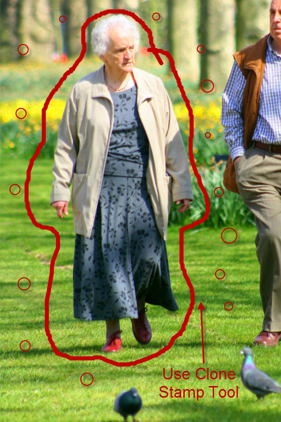 Now define some source points around the old lady and use the Clone Stamp Tool to paint over it. There is no established recipe on how you should use the Clone Stamp Tool in each specific case. Just use your common sense and try to cover the old lady totally. Don’t worry too much about repeating patches of grass or other irregularities for now as we will address them later.