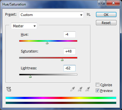 Set layer opacity to 100% again on both layers. Merge both texture layers by selecting them (Select first layer by clicking on it, keep pressing Ctrl and click on second layer) and press Ctrl+E. Change layer mode to Multiply. Finally change Hue and Saturation settings by going to Image > Adjustments > Hue/Saturation.