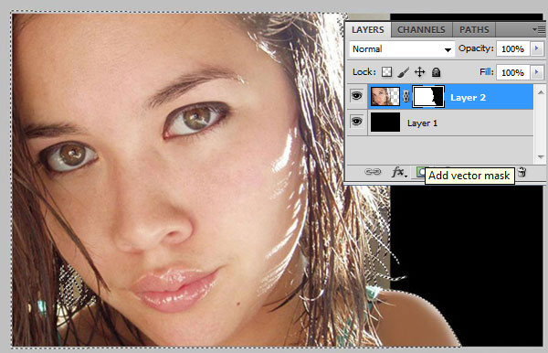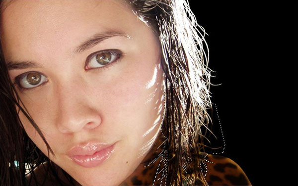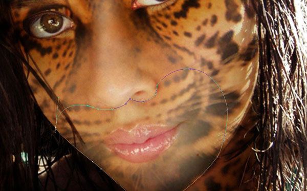 Our next step is to prepare photo to apply jaguar effect. Select Polygonal Lasso Tool to create selection of the woman. With selection made, click on button Add Layer Mask located on layers palette.