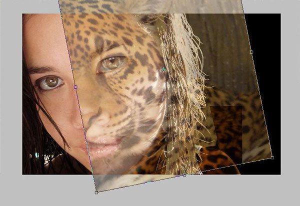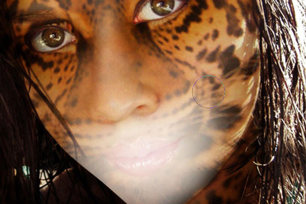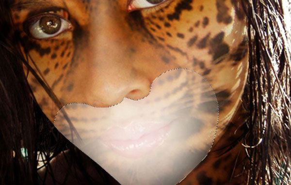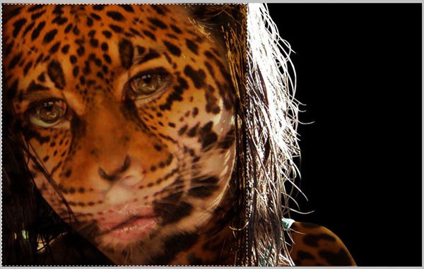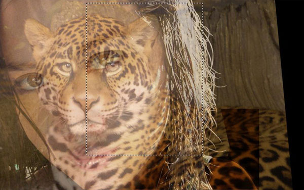 Now we are going to add texture to woman’s face. Select hidden layer with jaguar and make it visible again. Set up opacity to 70%. Select Rectangular Marquee Tool to create selection similar to mine. After that, invert selection (Select > Inverse) and press Delete to clear selection.