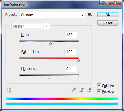 Update Hue/Saturation settings by going to Image > Adjustments > Hue/Saturation.