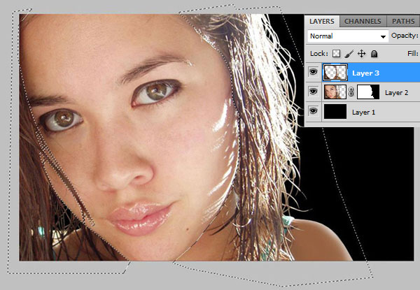Go to Select > Load Selection to make selection again. Hold down Alt key (a minus sign will replace plus sign on cursor) and select woman face still with Polygonal Lasso Tool. We are going to substract from selection and we will keep only hair, ear and neck. To finish click Ctrl+J to duplicate selection into a new layer.