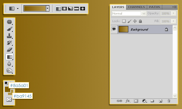 Create a new document, 1600px for the width and 1000px for the height. Set the Foreground color to #8a5a01, and the Background color to #ba9145, then drag a Linear Gradient from left to right. You can choose your own colors as well, or add an adjustment layer to change the colors as shown in the end of this tutorial.