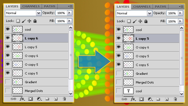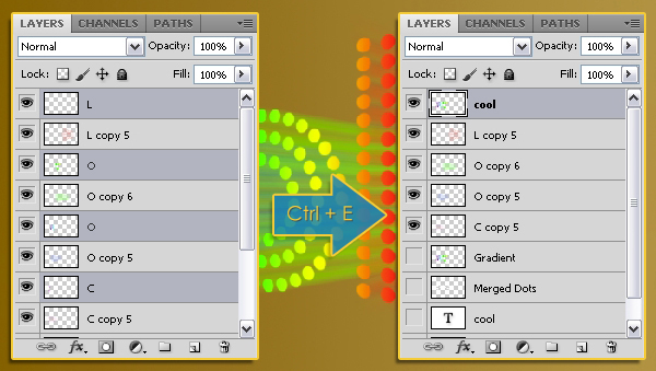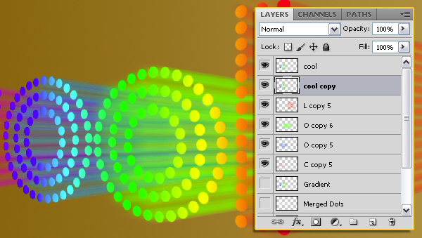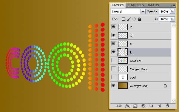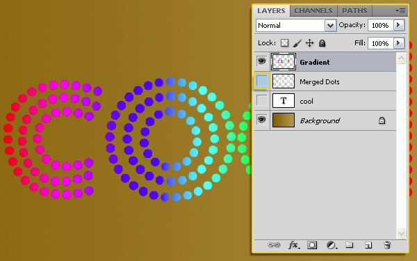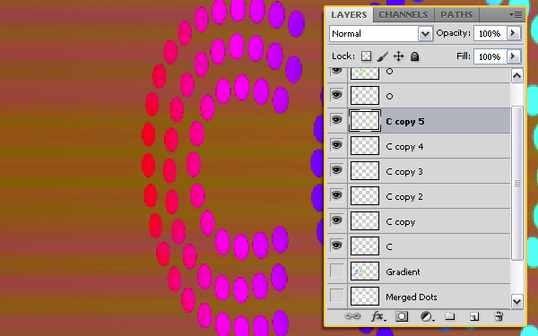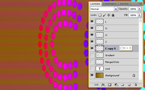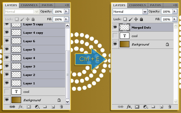 Select all the Dots layers, then go to Layer -> Merge Layers (Ctrl + E) to merge them in one layer, and call it “Merged Dots”.