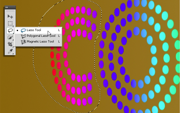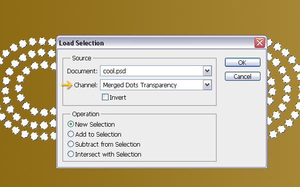 Make sure that the “Merged Dots” layer is active (selected), then go to Select -> Load Selection. Choose the “Merged Dots Transperancy” Channel. This will select the layer’s contents (the dots).
