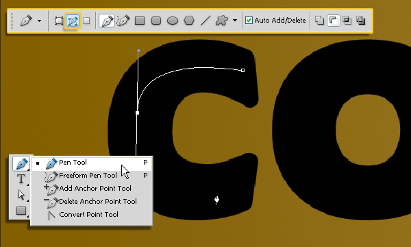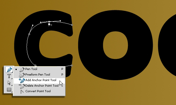 Use the Pen Tool, and make sure to click the Paths icon in the Options bar, to draw a curve in the middle of the first letter. Add the main anchor points, you can modify them later.