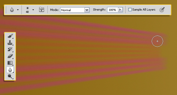 Pick the Blur Tool, and change the Options bar settings as shown below, then blur the lateral part of the extension.