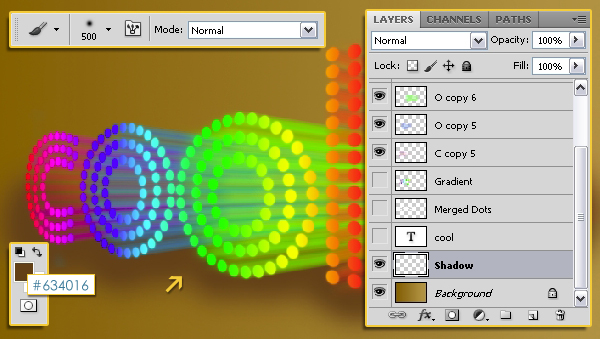 Create a new layer right on top of the Background layer and call it “Shadow”. Set the Foreground color to #634016, and use a soft round brush (500 px) to paint a shadow below the text.