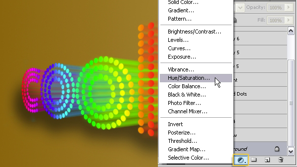 If you’d like to change the Background colors to add more contrast, then select the Background layer, and click the Create new fill or adjustment layer down the Layers panel, then choose “Hue/Saturation”.