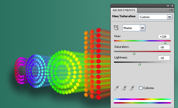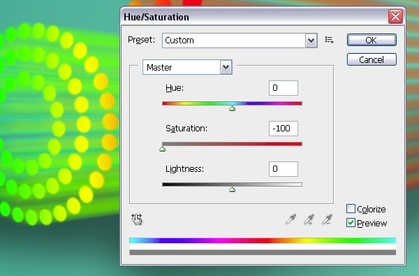Finally, select the “Shadow” layer once again, then go to Image -> Adjustments -> Hue/Saturation, and change the Saturation value to to -100 (to match the new Background colors).